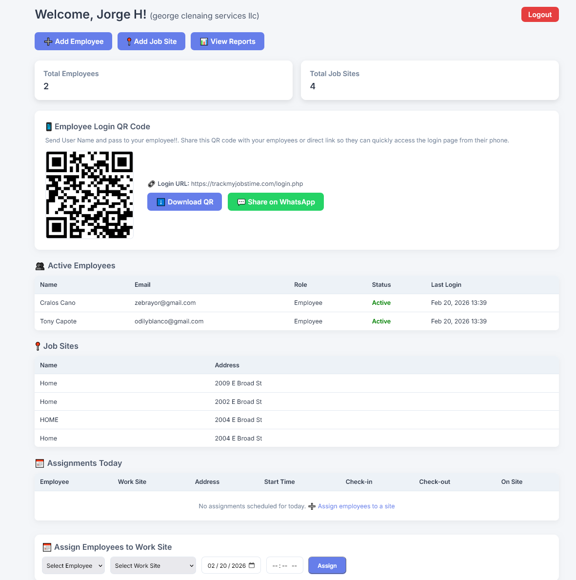 Share the login link or QR code with your team. They scan it, log in, and tap Check-In. Their location and time are recorded instantly — no app download needed.