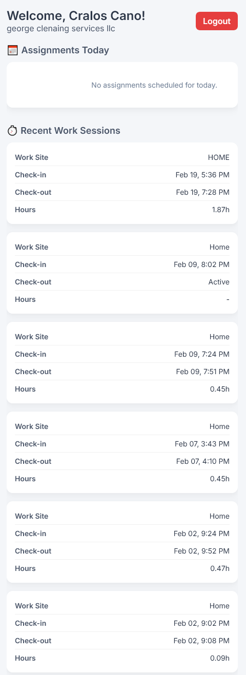 Hours are calculated automatically from check-in to check-out. No more manual timesheets, no more disputes, no more guesswork.