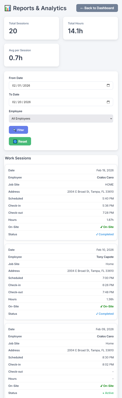 Your employees check in from the job site. You see exactly who's where, when they arrived, and how many hours worked — in real time, from any device.